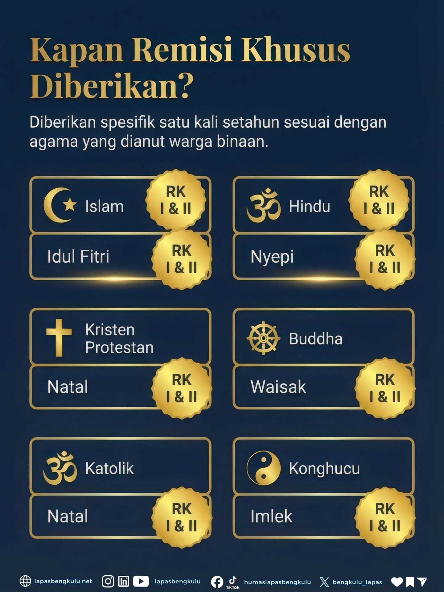 Di setiap hari besar keagamaan, warga binaan yang berkelakuan baik bisa mendapatkan Remisi Khusus, yaitu pengurangan masa pidana sebagai bentuk penghargaan atas perubahan sikap dan kesungguhan mengikuti pembinaan.