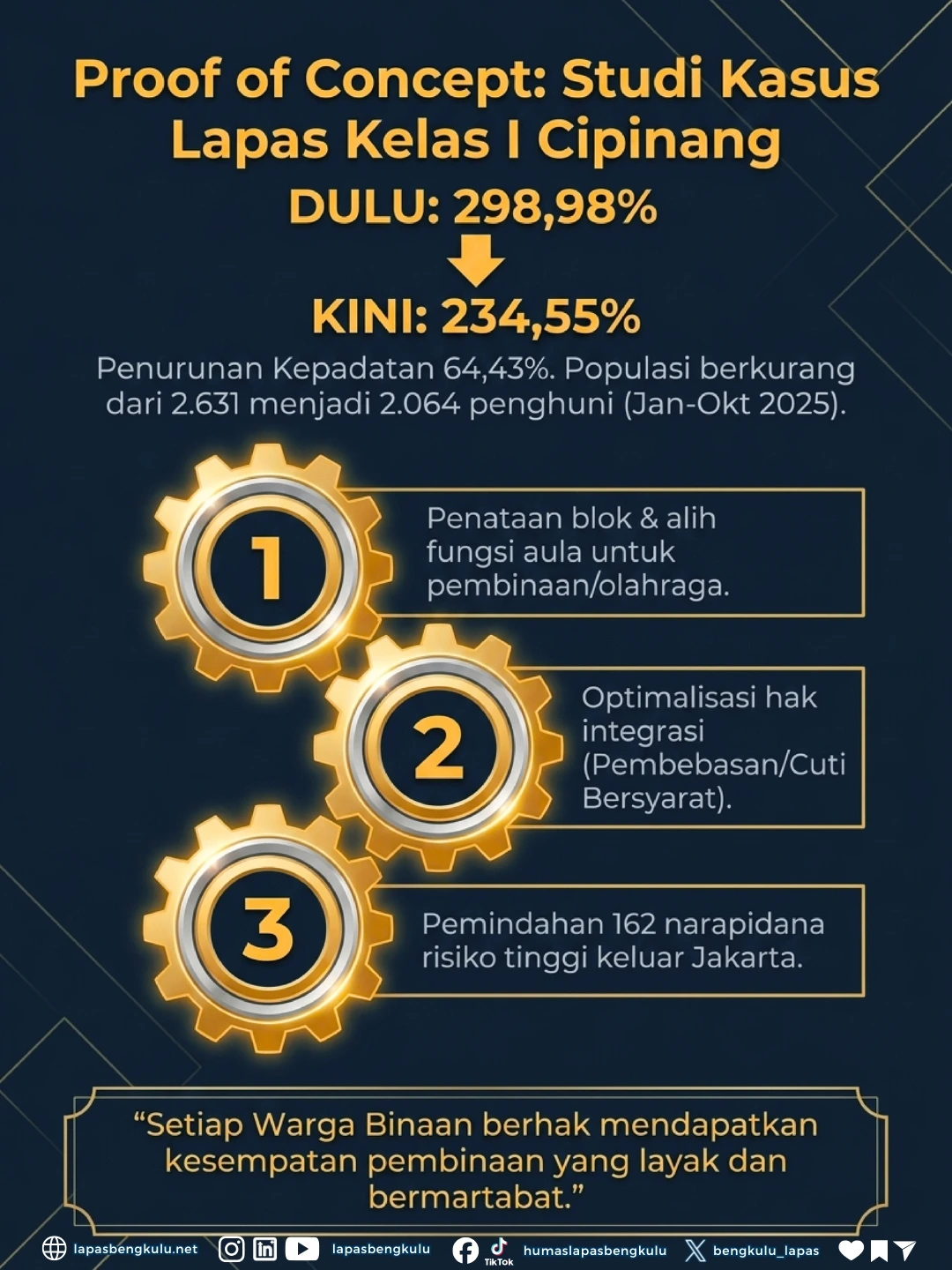 Keberhasilan ini didorong oleh langkah progresif seperti redistribusi penghuni dan optimalisasi pemberian hak integrasi secara terukur,. Dengan lingkungan hunian yang lebih manusiawi, kami optimis proses re-integrasi sosial warga binaan akan berjalan jauh lebih efektif,.