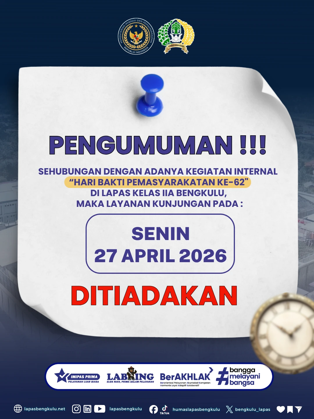 Sehubungan dengan adanya kegiatan internal Hari Bakti Pemasyarakatan ke-62 di Lapas Kelas IIA Bengkulu, diinformasikan bahwa layanan kunjungan pada: