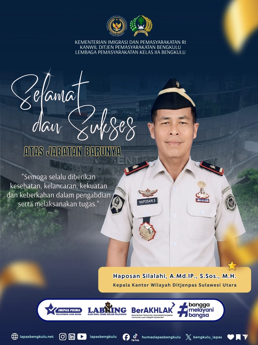 atas jabatan barunya sebagai Kepala Kantor Wilayah Ditjenpas Sulawesi Utara