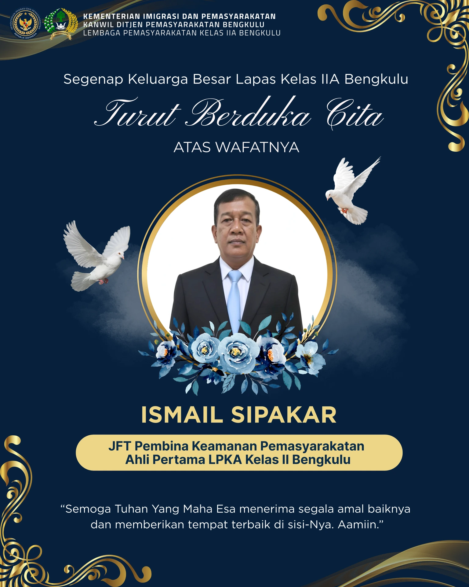 Turut Berduka Cita atas wafatnya Bapak Ismail Sipakar (JFT Pembina Keamanan Pemasyarakatan Ahli Pertama LPKA Kelas II Bengkulu)