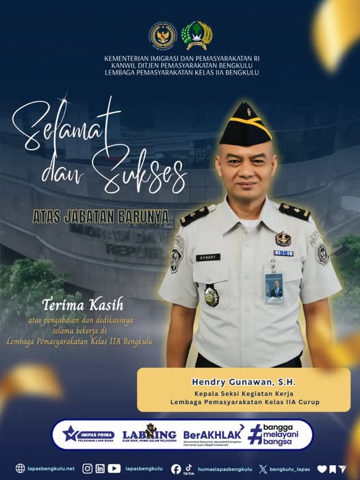atas jabatan barunya sebagai Kepala Seksi Kegiatan Kerja Lembaga Pemasyarakatan Kelas IIA Curup